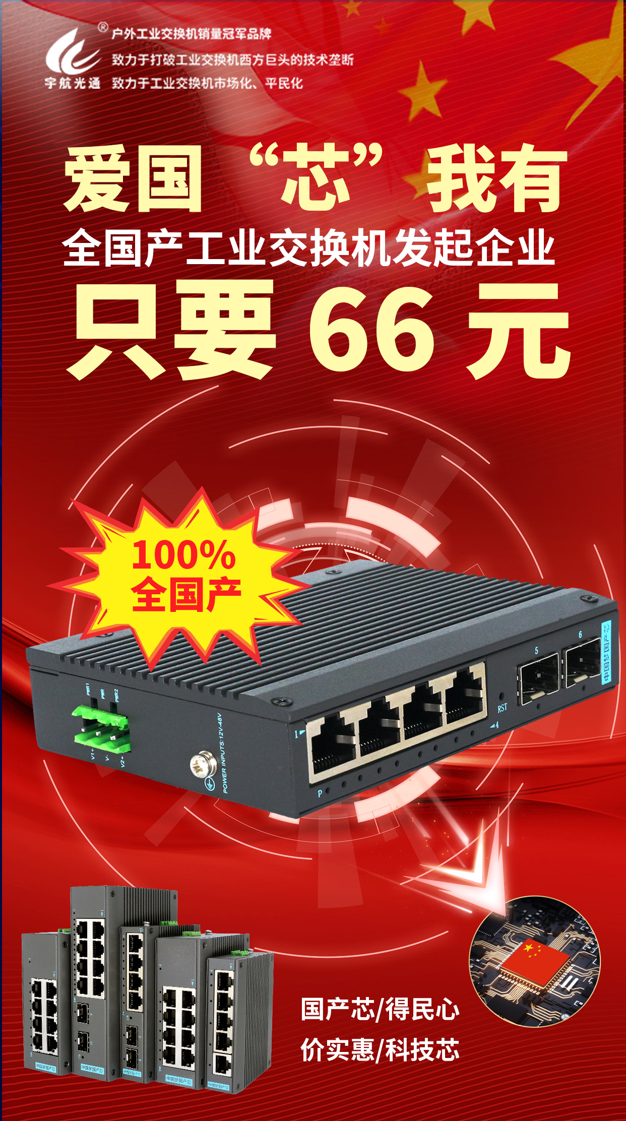 宇航工業交換機作為工業通信行業的領軍企業,肩負著推動產業科技創新與高質量發展的雙重使命。宇航不僅是科技創新的引領者,更是促進民營經濟騰飛的強大動力。面對集成電路、數字經濟等新興產業的蓬勃發展,宇航工業交換機展現出卓越的民企擔當,為這些領域提供了堅實可靠的網絡基礎設施。在攻克關鍵核心技術方面,宇航工業交換機始終走在行業前列,率先推出了全國產工業交換機。在芯片供應鏈受限的背景下,宇航更是以民族大義為己任,積極承擔企業責任,高舉全國產化工業的大旗,推動國產芯片在工業領域的廣泛應用。為了支持國產芯片產業的發展,宇航全國產工業交換機的售價僅為外資品牌的10%——僅需66元,以實際行動助力國產芯片的崛起。正如宇航工業交換機劉總所言,在工業交換機領域,宇航將堅定不移地打破西方技術封鎖,實現自主創新與自立自強。宇航將繼續完善產品線,提升技術水平,為工業通信行業的持續發展和國家的科技進步貢獻更多力量。