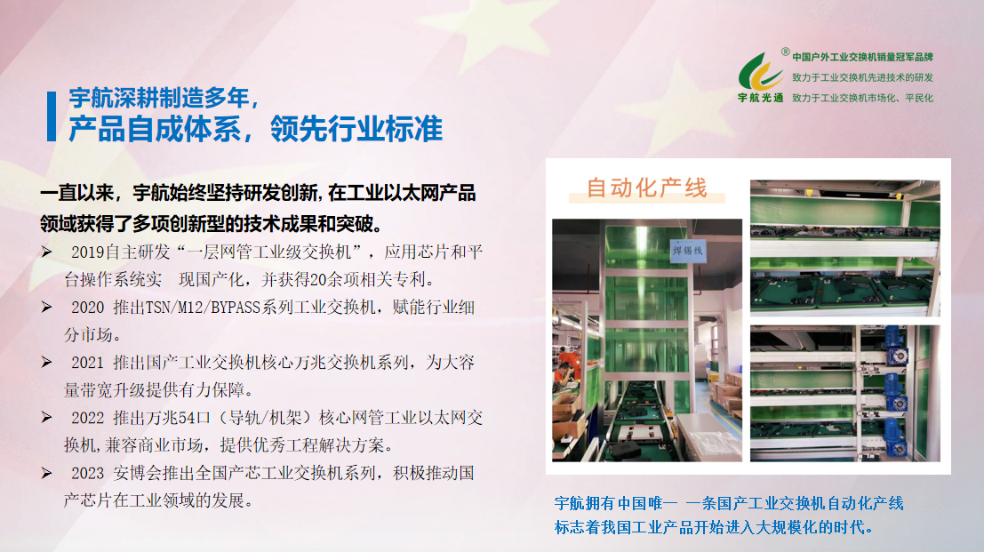宇航作為一家專注于工業(yè)以太網(wǎng)交換機(jī)研發(fā)、生產(chǎn)、銷售和服務(wù)于一體的國(guó)家專精特新小巨人企業(yè)、國(guó)家高新技術(shù)企業(yè),我們深知自身的成長(zhǎng)與發(fā)展離不開祖國(guó)的繁榮與昌盛。多年來(lái),我們始終秉承“創(chuàng)新驅(qū)動(dòng),質(zhì)量為本”的理念,為客戶提供高性能、高穩(wěn)定性的工業(yè)交換機(jī)產(chǎn)品,以實(shí)際行動(dòng)為祖國(guó)的建設(shè)貢獻(xiàn)力量。工業(yè)交換機(jī)作為現(xiàn)代工業(yè)通信的重要組成部分,承擔(dān)著數(shù)據(jù)傳輸、信息交換等關(guān)鍵任務(wù),也在智能制造、智慧城市、新能源等領(lǐng)域發(fā)揮著舉足輕重的作用。宇航始終緊跟時(shí)代步伐,不斷創(chuàng)新技術(shù),提升產(chǎn)品品質(zhì),以滿足日益增長(zhǎng)的市場(chǎng)需求。