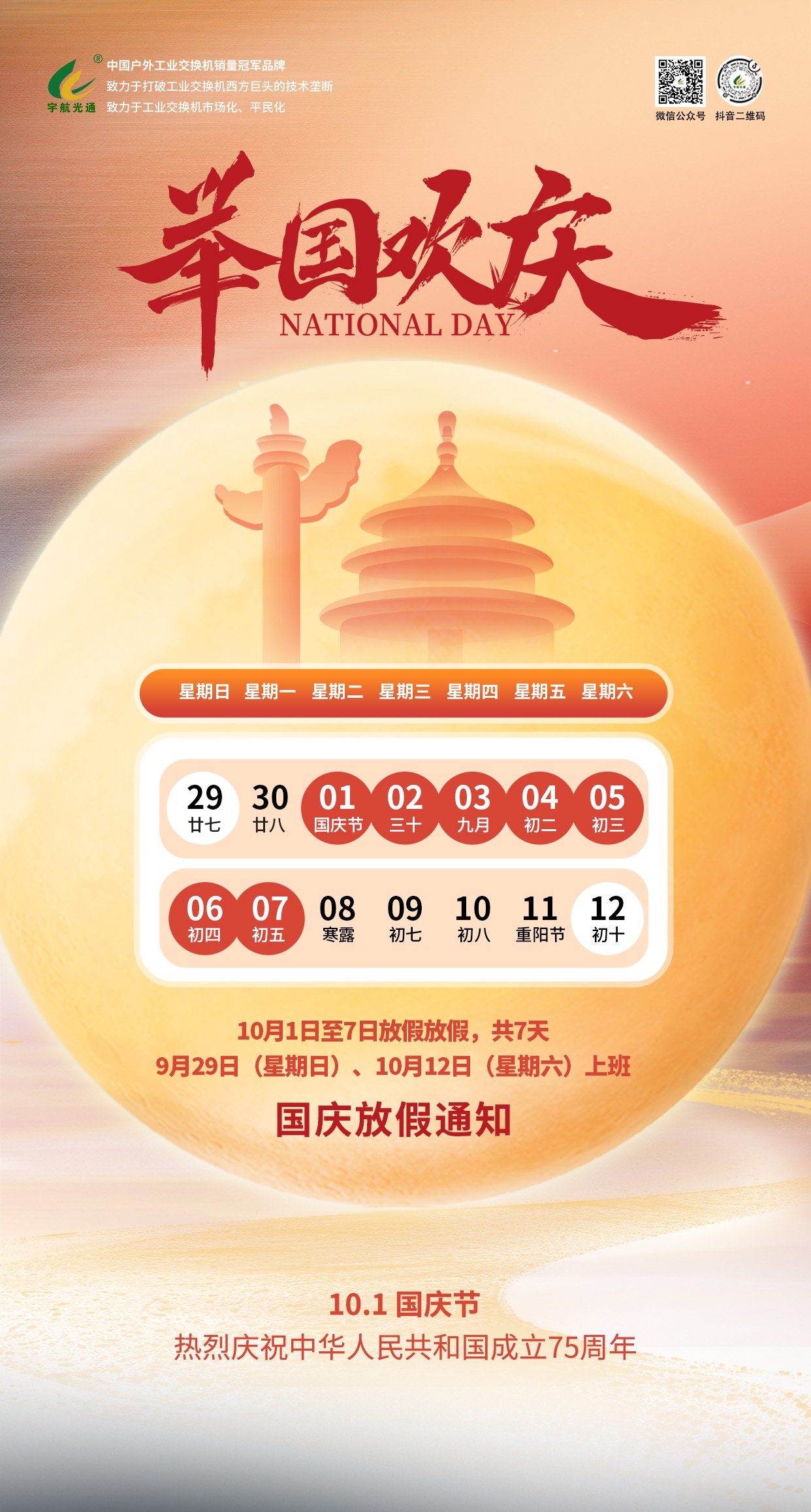 輝煌75載,祖國(guó)萬(wàn)歲!宇航工業(yè)交換機(jī)與您共度華誕!