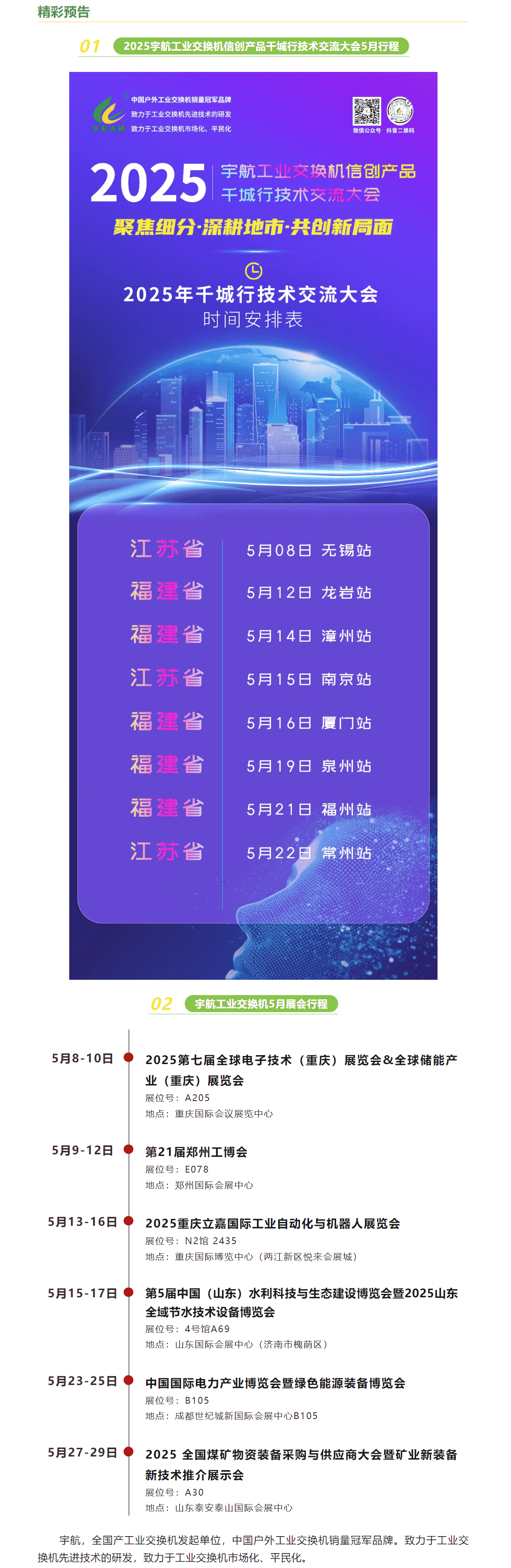 一夜熏風(fēng)吹春去,萬(wàn)物并秀迎夏來(lái)。2025宇航工業(yè)交換機(jī)信創(chuàng)產(chǎn)品干城行技術(shù)交流大會(huì)5月份將分別在浙江、福建、江蘇等省份盛大舉辦,具體涵蓋了8個(gè)地市。另外,5月份宇航工業(yè)交換機(jī)將亮相重慶儲(chǔ)能展、鄭州工博會(huì)、重慶自動(dòng)化展、山東水展、四川電力展以及全國(guó)煤礦展等各大展會(huì),期待您的蒞臨!