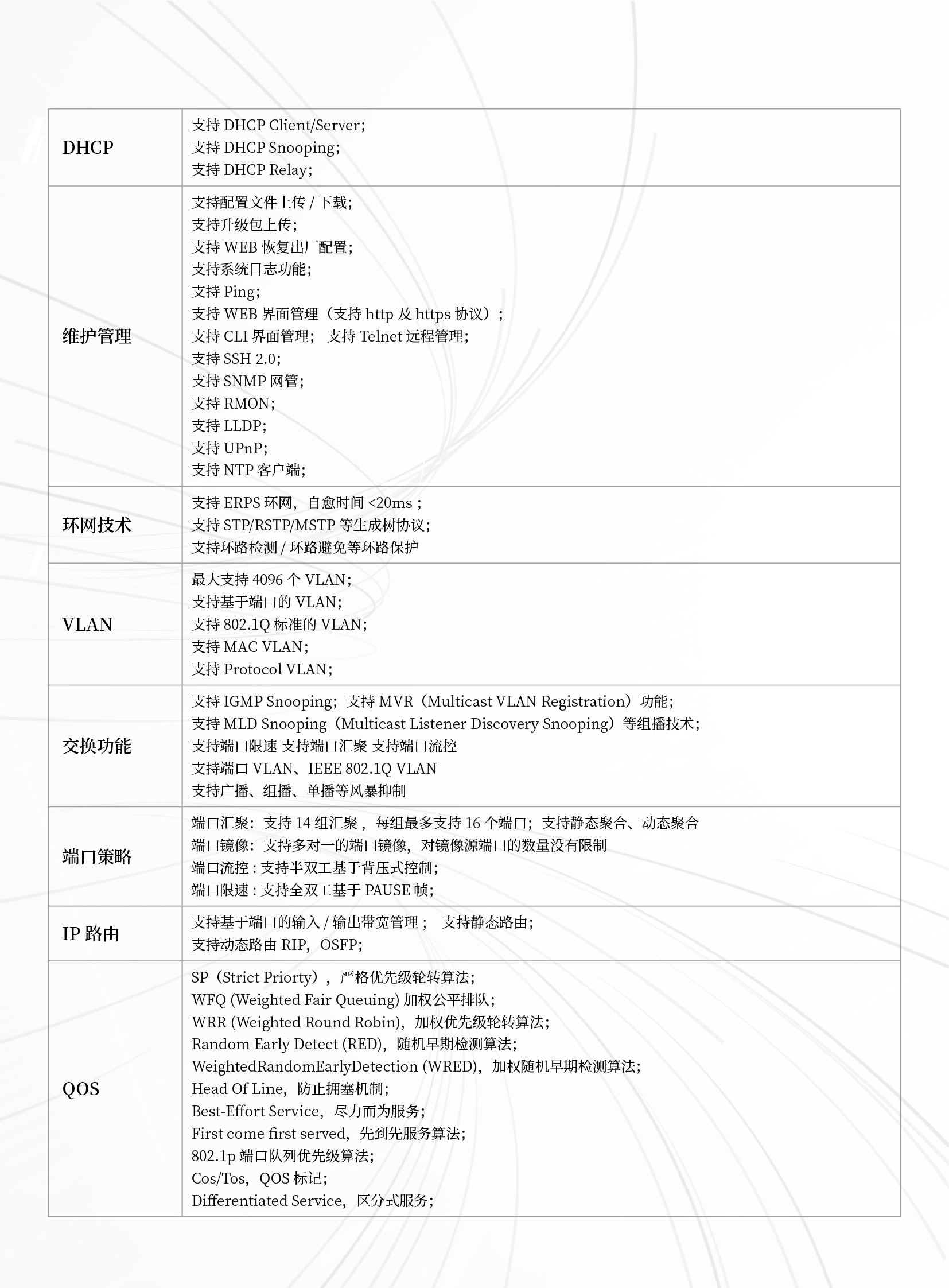 硬件支持IP ACL,MAC ACL,Vlan ACL,基于三、四層的ACL功能 |