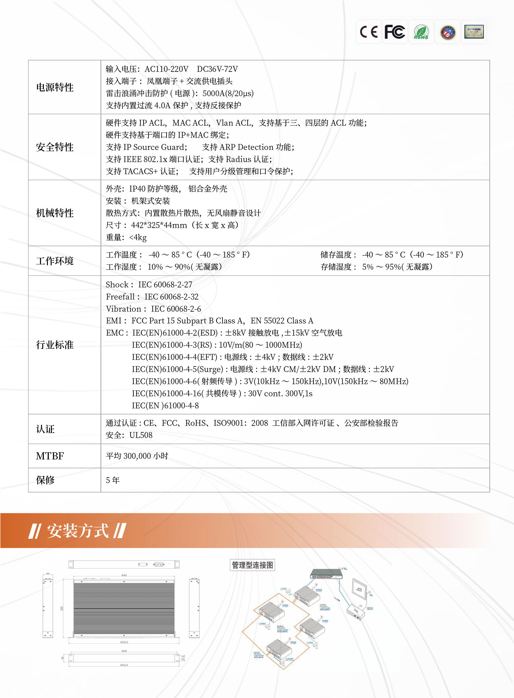 電信級雙電源冗余保護、三級防雷設計,符合國際IEC61000-4-5標準;符合安規(guī)EN60950、IEC60950標準,適應各種復雜安裝環(huán)境及惡劣天氣。
