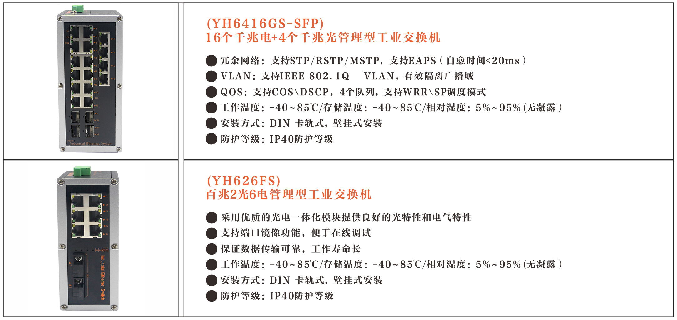 (5) 采用YH®自愈環網技術,快速自愈保護,提供高可靠通信的保證     (6) 抗擊強電磁干擾和浪涌,在-40℃~85℃的環境溫度中無風扇穩定運行,適合惡劣環境下應用